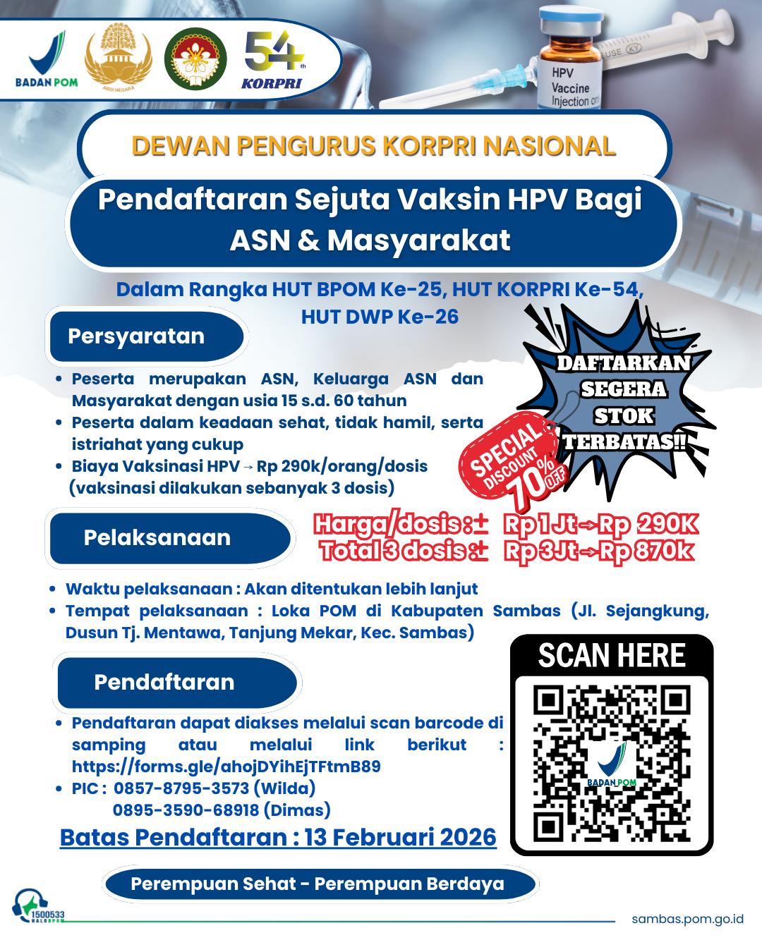 Dalam kunjungan tersebut, LOKA POM Kabupaten Sambas menyampaikan beberapa hal penting, antara lain rencana pelaksanaan vaksinasi HPV yang akan dilaksanakan di Loka POM Kabupaten Sambas, dengan waktu pelaksanaan yang akan diinformasikan lebih lanjut. Sasaran kegiatan ini meliputi ASN, keluarga ASN, serta masyarakat umum yang memenuhi persyaratan kesehatan.
